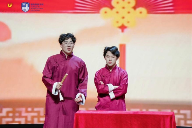 相声《如此上学》以幽默诙谐的表演再现校园趣事,台下笑声不断。